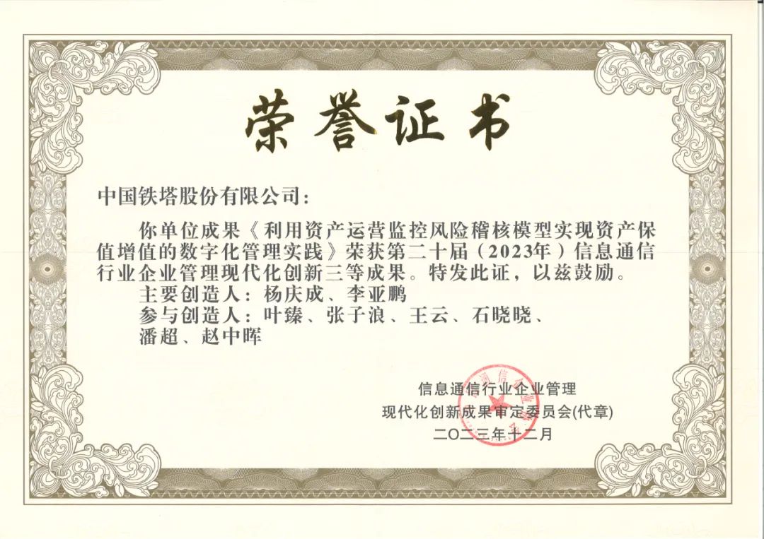 近日,信息技术研究院资产运营组申报的《利用资产运营监控风险稽核模型实现资产保值增值的数字化管理实践》项目在第二十届通信行业企业管理现代化创新活动中,从数百项申报成果中脱颖而出,获得行业优秀成果三等奖(省部级)。