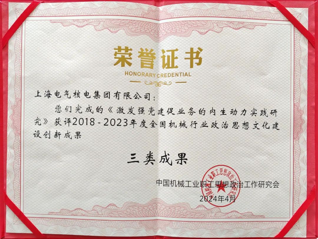 核电集团荣获全国机械行业政研工作优秀单位,《激发强党建促业务的内生动力实践研究》荣获全国机械行业政治思想文化建设创新三类成果。