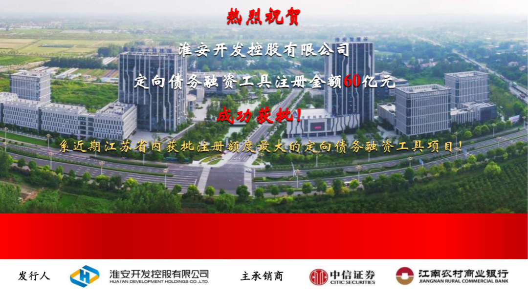 4月24日,淮安开发控股有限公司定向债务融资工具注册金额60亿元成功获批,系近期江苏省内获批注册额度最大的一单定向债务融资工具项目!