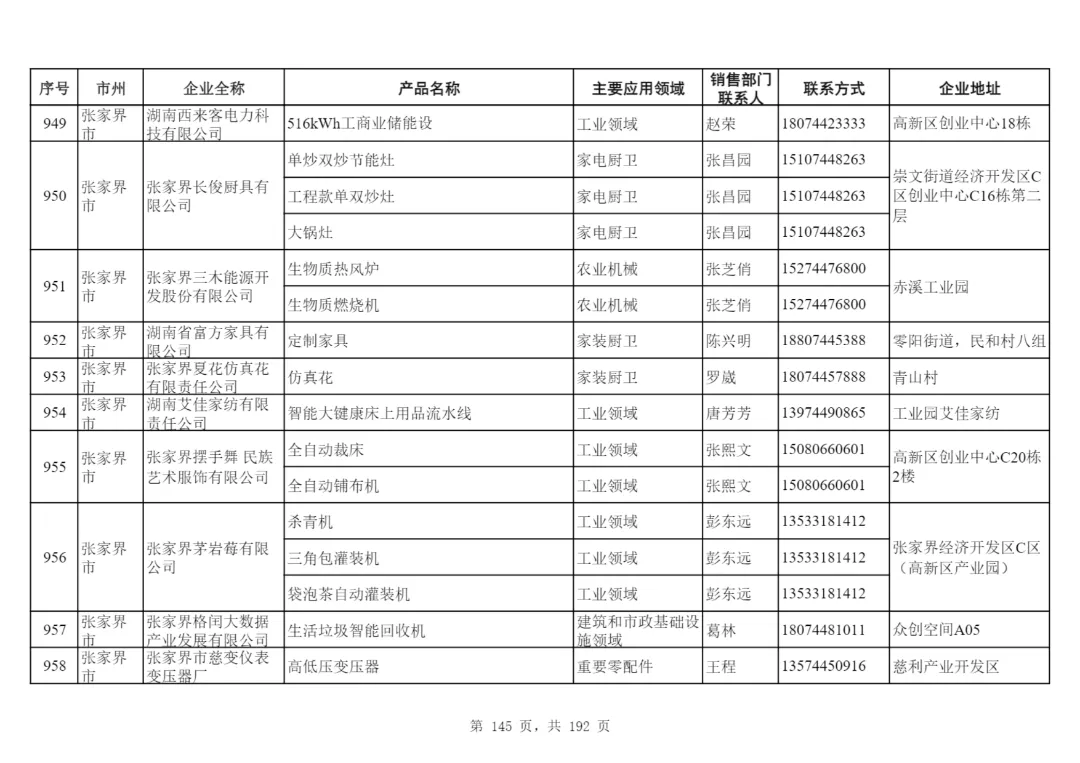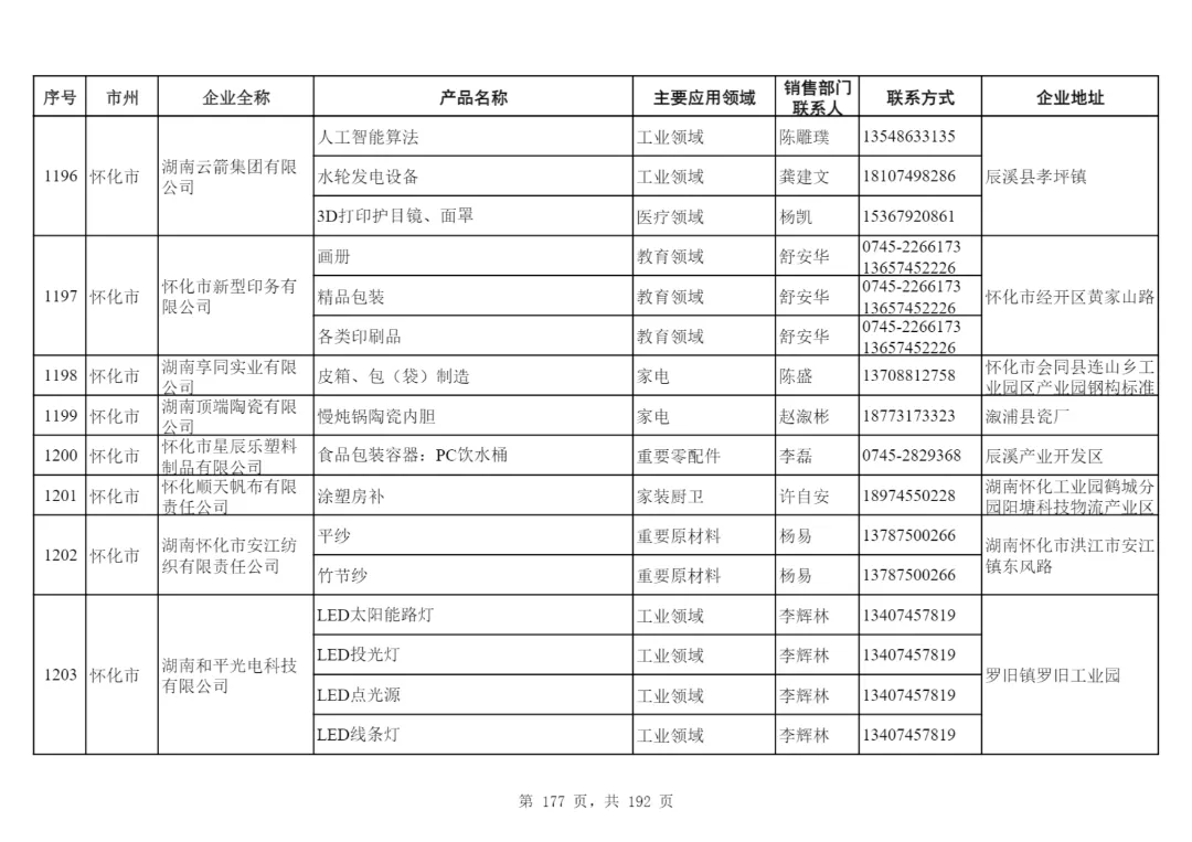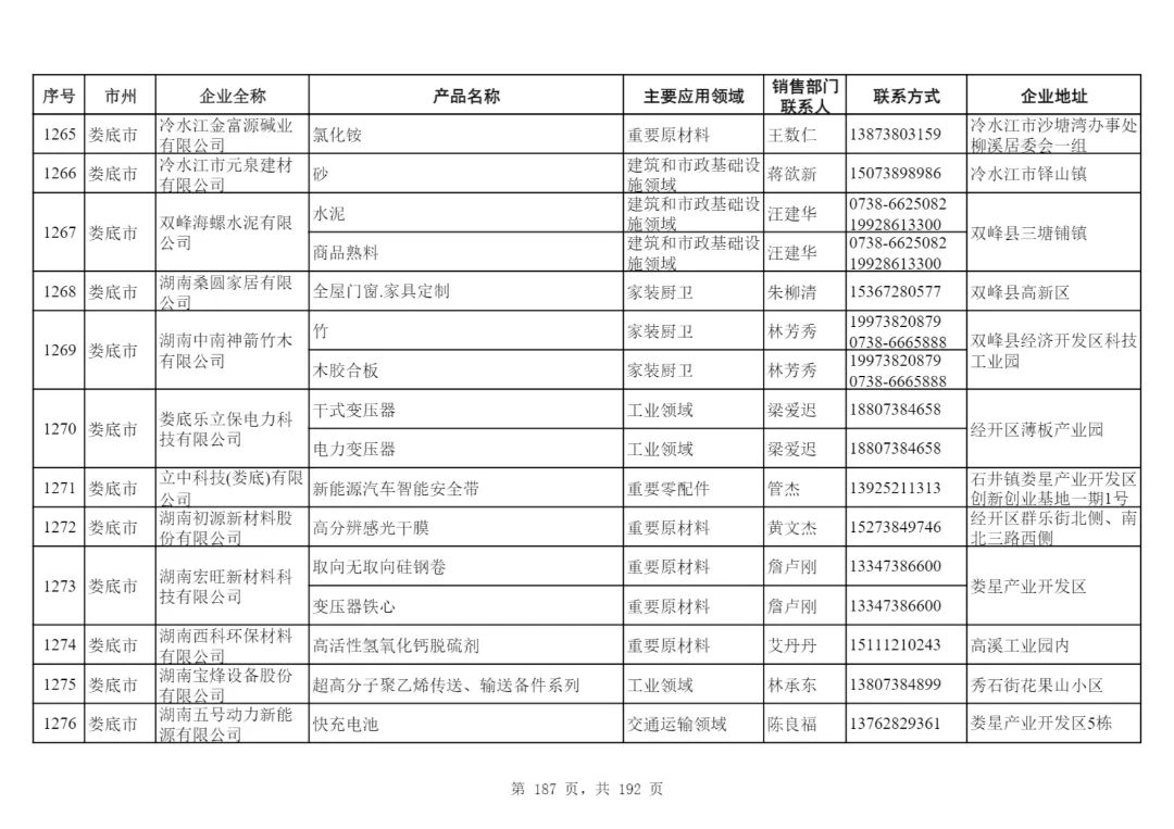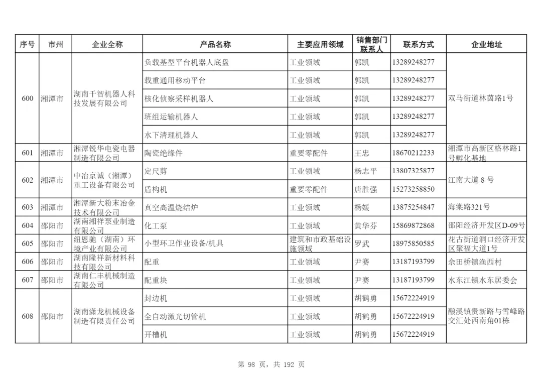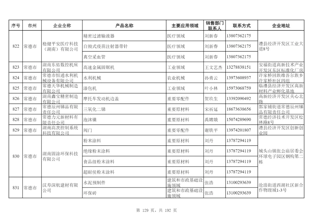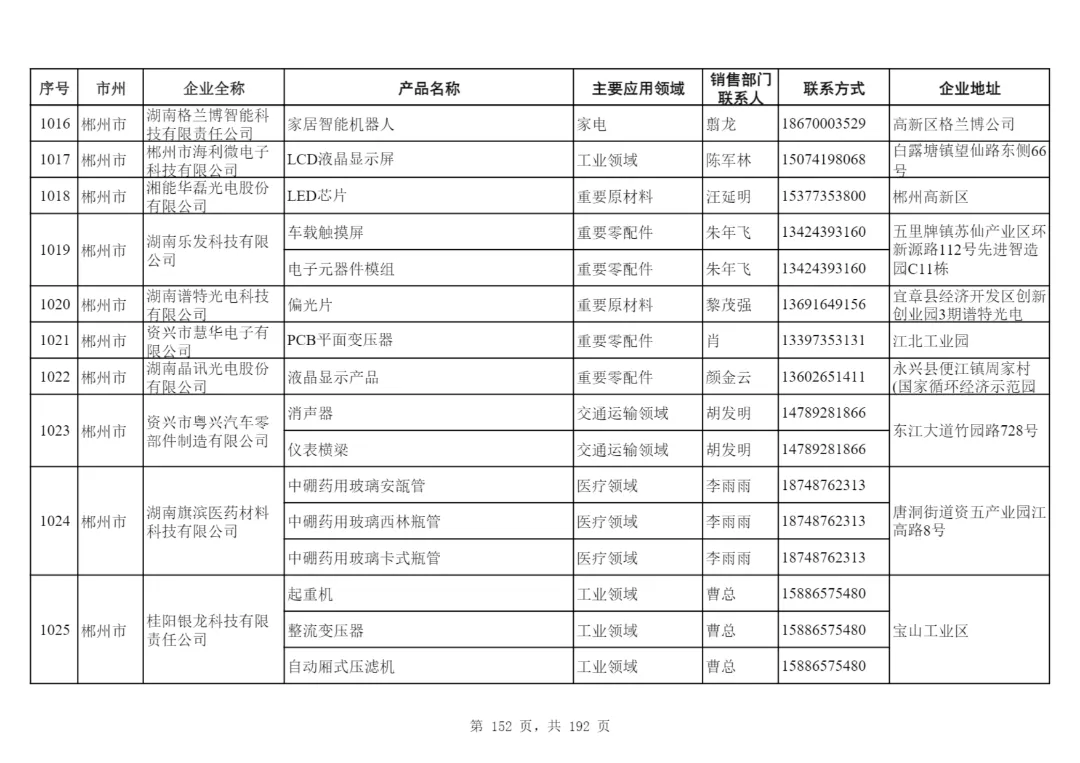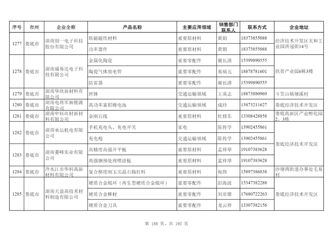 序号 | 市州 | 企业全称 | 产品名称 | 主要应用领域 | 销售部门 | 联系方式 | 企业地址 |