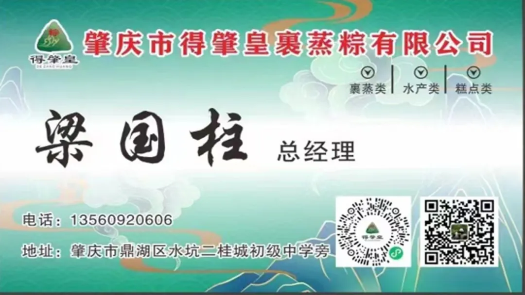 梁国柱(肇庆市得肇皇裹蒸粽创始人)介绍:我是一名退伍军人,对家乡裹蒸粽非常有情怀,现在在鼎湖区有自己的工厂,希望在政府领导的指导帮助下,与众多的乡亲一起,把肇庆裹蒸产业做大做强,让全球更多人品偿到肇庆裹蒸粽。