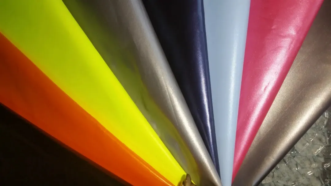 通过对织物表面珠光涂层,使织物表面具有珍珠般光泽,有银色和彩色的。做成服装非常漂亮。也有PA珠光和PU珠光之分,PU珠光比PA珠光更加平整光亮,膜感更好,更有“珍珠皮膜”的美称。