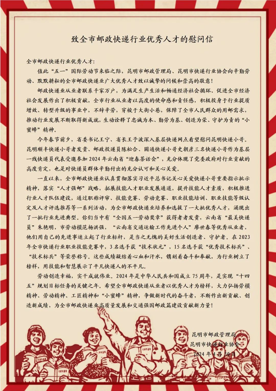 致全市邮政快递行业优秀人才的慰问信