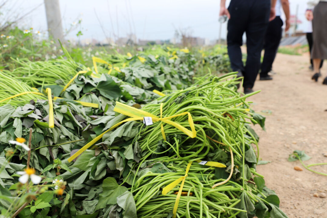 由于到访参观当天正处蕃薯苗滕收获旺季,青绿一片、东西南北茫不见边际的蕃薯种植基地,随处可见一拨又一拨工人,正在熟练的收割着蕃薯苗滕,收获好的随即包扎成捆,然后贴上基地公司标识。参观人员随意问工人那标识是干什么用的?工人解释说,那是“蕃薯滕”身份的象征,可见基地种植已具有相当好的商标自我保护意识。