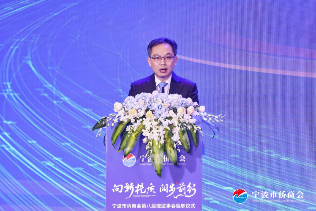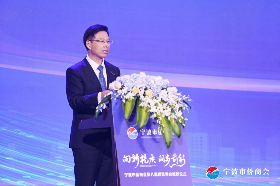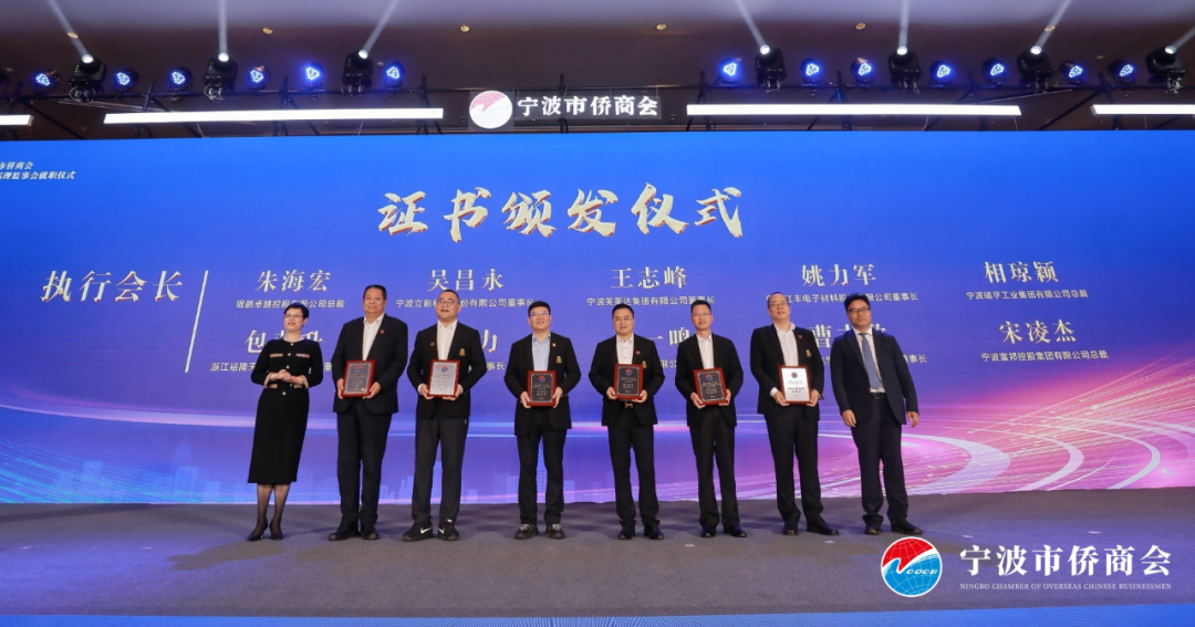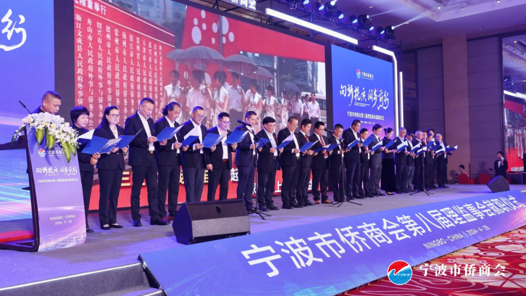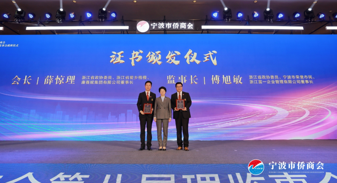 在就职仪式上,林雅莲为宁波市侨商会第八届理事会会长薛惊理、监事会监事长傅旭敏颁发聘书。李关定、姚君明为宁波市侨商会第八届理事会执行会长代表颁发聘书。