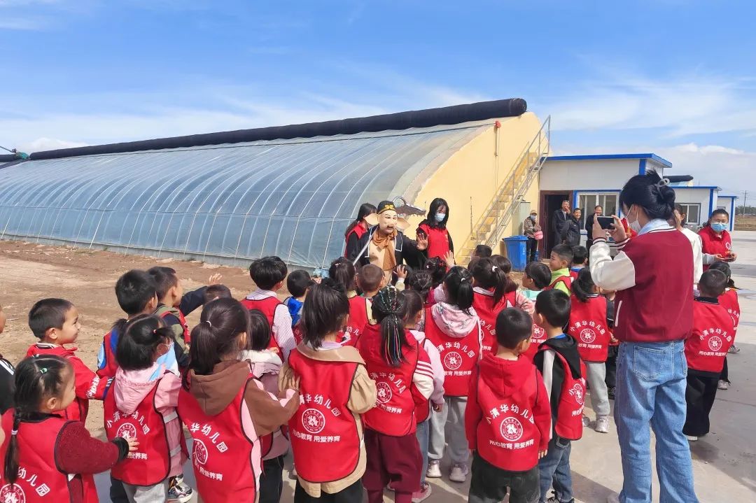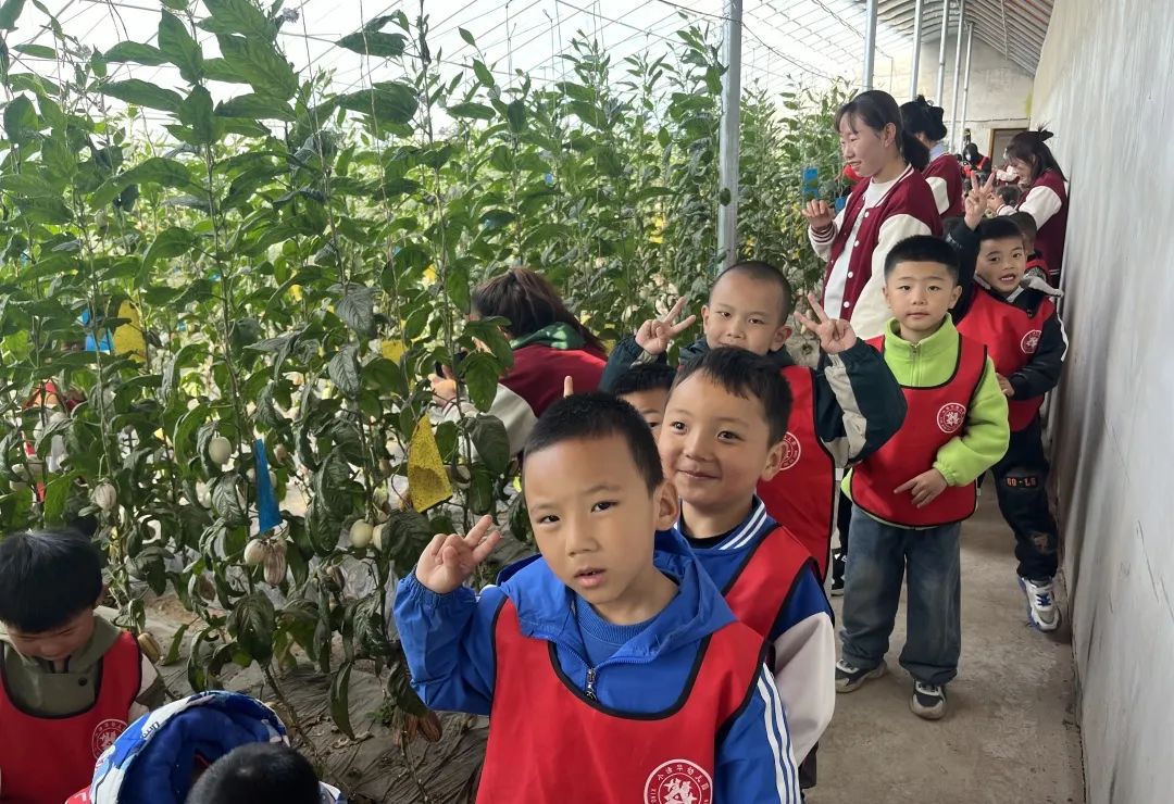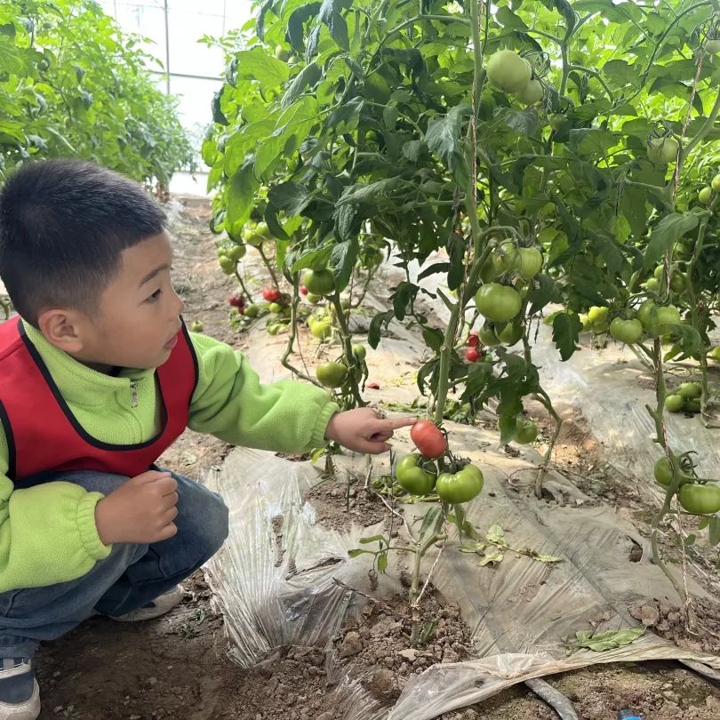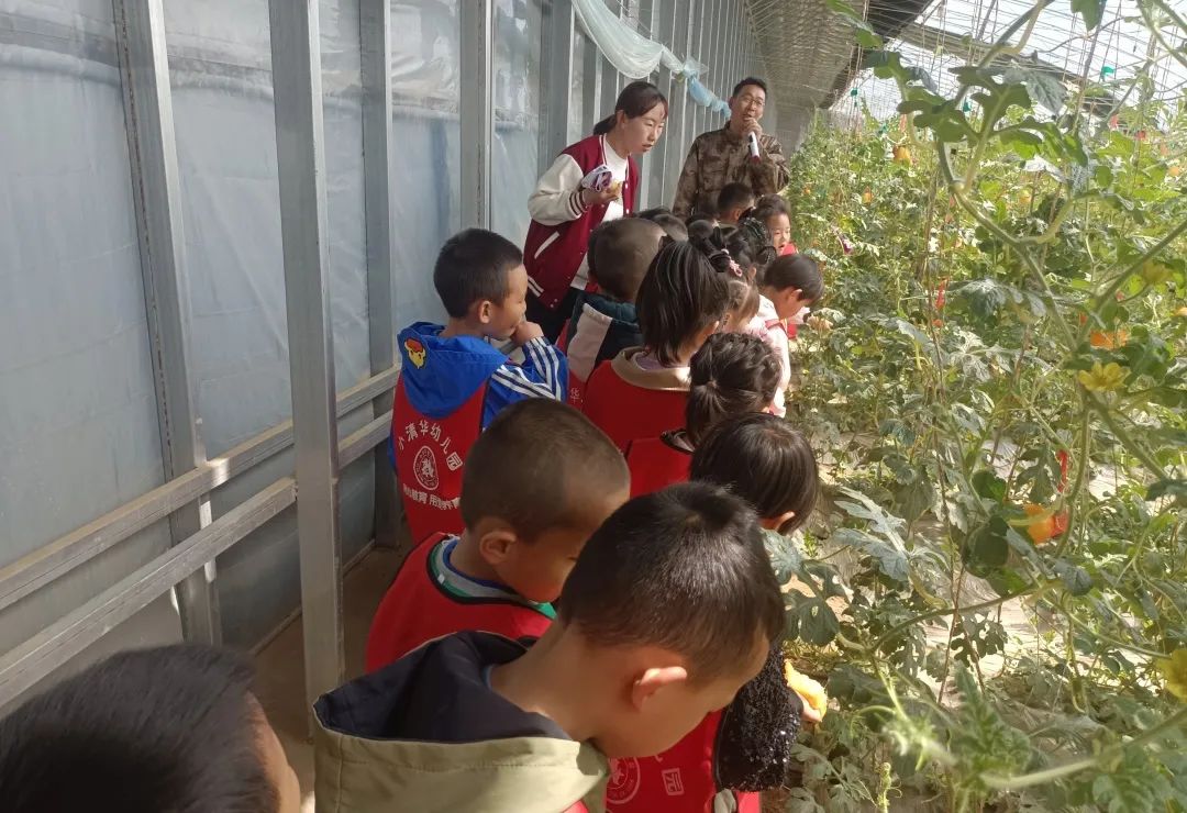 室外风和日丽,室内春暖花开;室外枝条未动,室内芳香四溢;室外花枝招展,室内果实累累果香扑鼻。孩子们走进下庄子温室大棚里,听着下庄子村书记晁丽的介绍,“这一个个‘金果果’就是猪八戒最喜欢的人参果,金黄的果皮上点缀着紫色条纹表示这个人参果成熟了。‘红果果’缀满枝头,这是你们天天吃的西红柿。”小朋友问道:“这个绿色的果果是不是不能吃,只有它变成红色的果子才可以吃呀?”“对呀!小朋友真棒,奖励你一颗西红柿”
