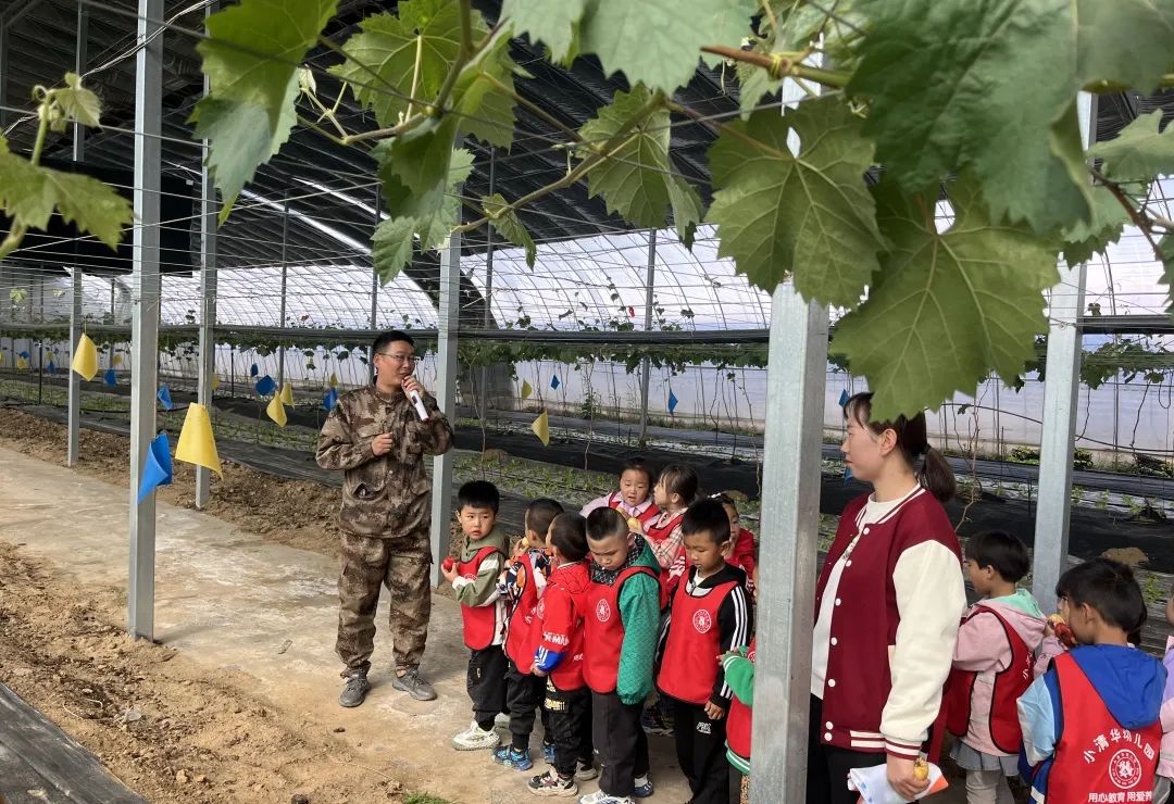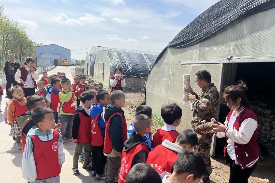 走进西河桥村菌菇种植大棚,菇香扑鼻而来,架子上排列整整齐齐的菌棒也在举手欢迎着小朋友们的到来。“你看、你看,这个冒头的蘑菇像不像天空的云朵呀?”“我看更像一朵圆乎乎的花朵。”孩子们一边兴致勃勃的观察,一边分享自己天马行空的想法。西河桥村赵路书记在一旁为孩子们介绍菌种的生长环境、菌菇的营养价值等等。随后,志愿者带领孩子们一起参观了西河桥村特有的葡萄、西瓜大棚,在看一看、听一听、摸一摸、闻一闻之中增进小朋友们对农业知识的了解,真正体会到“一粥一饭 当思来之不易”的含义。