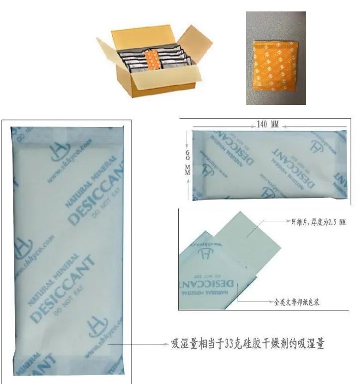 以植物纤维为基材的复合材料,吸湿后变软,便于识别。可降解且循环使用,绿色环保,25℃/90%条件下饱和吸湿量是自身重量的1-1.5倍,比硅胶高出3-5倍。没有因破包而颗粒泄露的隐患,安全可靠,特殊的生产工艺,2022年获得中国发明专利。