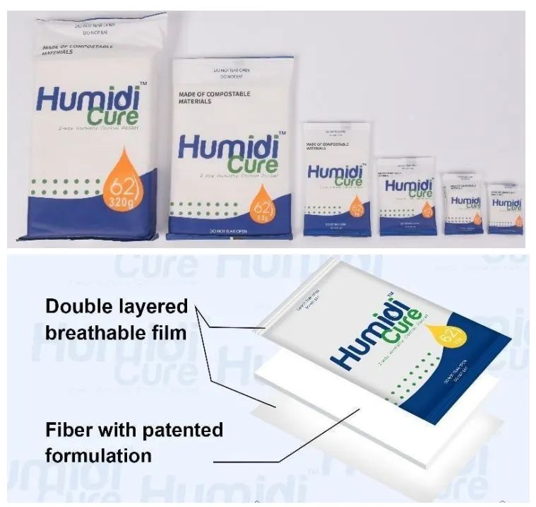 环保型,由100%可堆肥材料制,100%防漏,不含液体,易于使用。免费RH指示卡,无污染风险,不接触包装,调控容器中的湿度,不仅仅是维持湿度,活化时间快3倍,持久性好。12个月密闭保存期,4个月有效使用期,尺寸范围广,从1.5克到320克不等,湿度值、尺寸、印刷可定制。