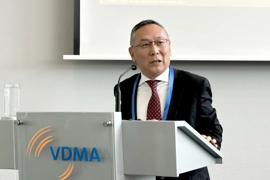 会上,徐迎新发表题为《中国纺织工业的发展现状与展望》的演讲,就中国纺织工业的发展情况,纺织现代化产业体系建设的探索实践和未来合作方向,进行了分享交流。关于中国纺织工业发展情况,徐迎新谈到,2023年,面对复杂的外部环境,中国纺织工业迎难而上,保持回升向好态势,实现平稳发展。2024年以来,中国纺织工业运行延续回升向好态势,产业发展中的积极因素不断增多,市场信心增强。徐迎新还分享了中国纺织现代化产业体系建设取得的积极进展。一是加快材料创新。中国高性能纤维产能占全世界的比重超过1/3。碳纤维、石墨烯、生物基材料、3D打印材料等制备与应用持续发展。二是聚焦融合发展。推动场景创新、应用创新,在与数字经济、生物经济、大健康、深海深空、绿色环保、新能源等行业的交融中打造新兴产业、未来产业。三是推进数字转型。持续完善工业互联网、大数据中心等行业新型基础设施,推进全产业链数字化转型。从网络化协同、平台化设计、智能化制造,到柔性供应链、智慧型营销、沉浸式体验,产业流程再造、场景创新持续发展。四是加快绿色发展。积极构建低碳绿色循环产业体系。加速技术攻关,发展循环经济。中国纺联通过对纺织服装企业ESG绩效进行科学有效评估,推动ESG信息披露工作。五是推动品类创新。挖掘文化价值和生活方式,推动品类创新。新中式服装快速发展,暴汗服、360度防晒衣、冲锋衣、骑行服等集时尚与功能性于一体的穿搭成为流行,舒适、自由的穿着体验和自我感受成为新趋势。纺织机械是产业发展的支撑、转型升级的引擎、产业链稳定的基石。徐迎新进一步介绍了中国纺织机械行业的情况和行业发展方向:一是顺应智能化、绿色化转型趋势,纺织装备和配件向高端化、专业化方向发展。二是为实现双碳目标,推动提质增效,中国纺织加快设备升级。在发言中,徐迎新还介绍了中国纺织现代化产业体系的未来发展。面对全球产业的调整,科技创新的跃迁,以及应对气候变化带来的挑战,中国纺织行业正以科技、文化、绿色为重点,发展新质生产力,在深化开放中推动新型工业化进程。一是推动产业创新。深化对外开放,加强国际科技合作。二是加强文化赋能。推动时尚产业发展。三是深化绿色转型。落实双碳目标,开展ESG实践。四是强化智慧发展。适度超前、有序建设产业新型基础设施,筑牢产业发展的数字基座。会上,德国纺织机械协会哈拉尔德·韦伯(Dr. Harald Weber)博士就全球纺织机械行业形势和展望进行发言。来自孟加拉国、西班牙、印度、印度尼西亚、韩国、土耳其和越南的纺织企业代表分享了各自纺织经济及市场展望。来自瑞士立达(Rieter)、德国欧瑞康(Oerlikon)、比利时必佳乐(Picanol)、德国布鲁克纳(Bruckner)、荷兰施托克(SPGPrints)等纺机企业的代表分享了各自2023年度市场表现,并对2024年市场趋势进行展望。