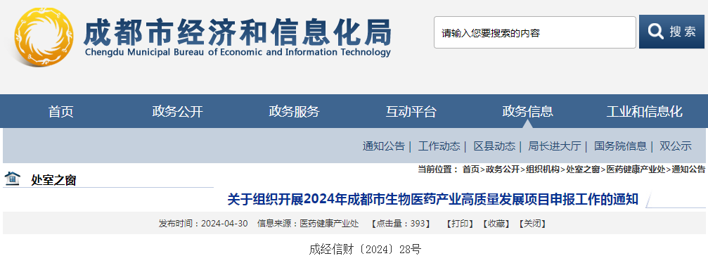 为贯彻落实市政府办公厅《关于印发促进成都生物医药产业高质量发展若干政策的通知》(成办函〔2019〕73号)等文件精神,现将申报成都市2024年生物医药产业高质量发展项目有关事项通知如下。