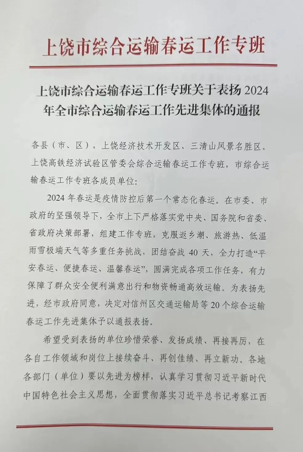 2024年3月18日,上饶市综合运输客运工作专班发布了《关于表扬2024年全市综合运输春运工作先进集体的通报》。上饶市城控集团公交公司信息指挥中心荣获上饶市“2024年全市综合运输春运工作先进集体”荣誉称号。
