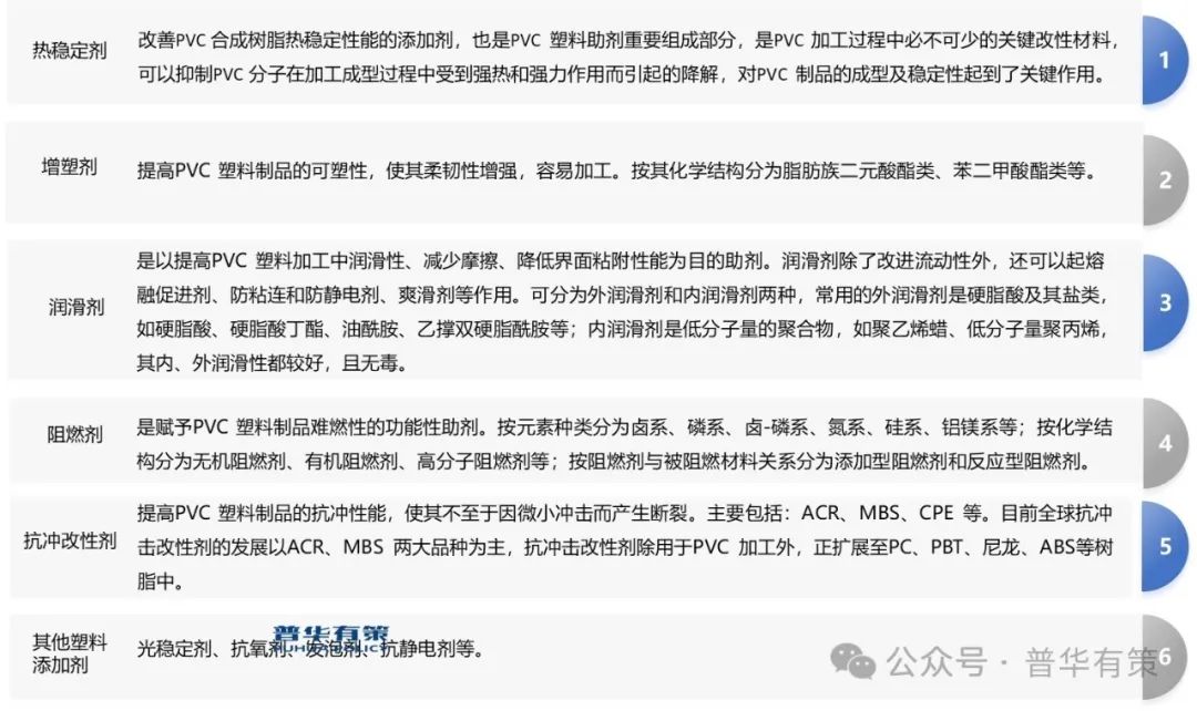 PVC塑料助剂种类繁多,根据不同的用途,可分为热稳定剂、增塑剂、阻燃剂、润滑剂、抗冲改性剂等。其主要分类如下:
