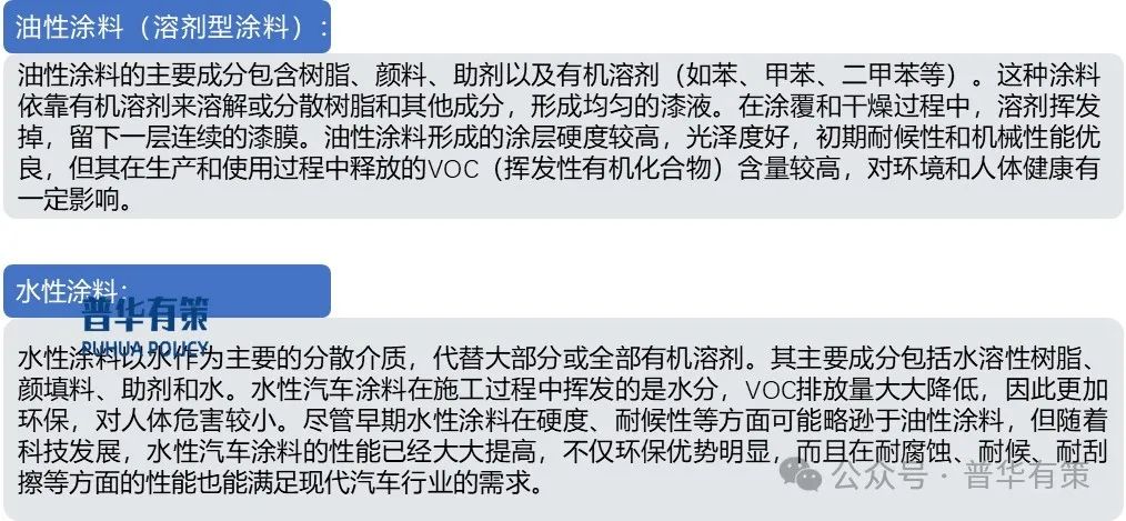 汽车涂料按照其中溶解介质的不同,主要可以分为油性涂料和水性涂料两大类: