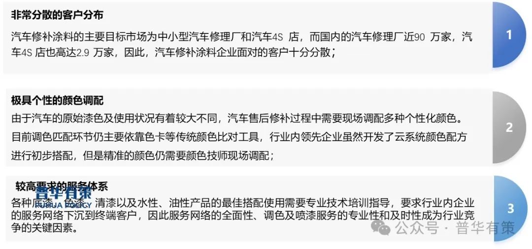 汽车修补涂料是汽车涂料的重要组成部分,属于汽车后市场领域,用以恢复极端温度、石头、事故造成等外部因素造成的损坏。汽车修补涂料按涂层功能可以分为底漆、原子灰、中涂漆、色漆、清漆等涂层。相比于汽车车身涂料,汽车修补涂料颜色种类更为复杂,维修修补恢复如新难度更大,汽车维修地域极为分散,产品使用场景差异较大。具体特征如下: