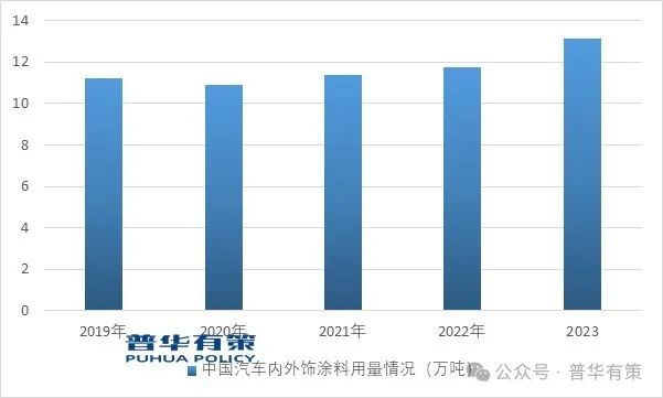 我国汽车内外饰涂料市场的发展与我国汽车产量息息相关。2023年,我国汽车产销量首次均突破3000万辆,分别完成3016.1万辆和3009.4万辆,同比分别增长11.6%和12%,年产销量双双创历史新高,实现两位数较高增长。汽车内外饰涂料主要用于保险杠、轮毂、格栅和尾翼等外饰件和方向盘、中控台、门把手和按钮等内饰件。据测算,平均每辆汽车内外饰零部件涂料用量约为4,355克,结合我国汽车产量数据,2023年我国汽车内外饰涂料用量约13.14万吨。