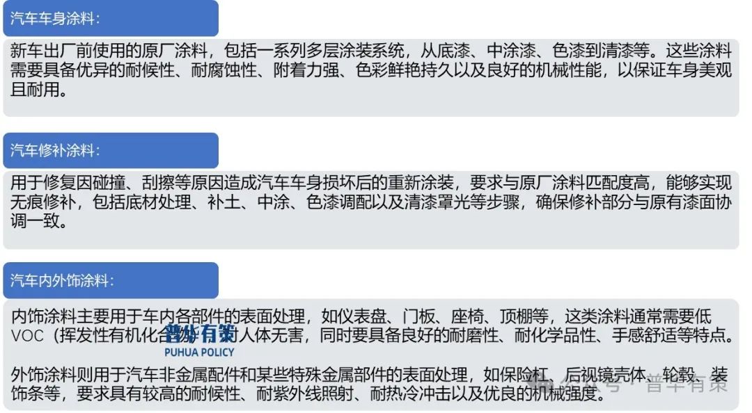 汽车涂料是一个广泛的类别,包括汽车车身涂料、汽车修补涂料、汽车内外饰涂料等。汽车车身涂料是汽车出厂前统一涂装所用的涂料;汽车修补涂料是用于汽车表面修补护理的涂料;汽车内外饰涂料指的是汽车外饰及汽车内饰所用的涂料。