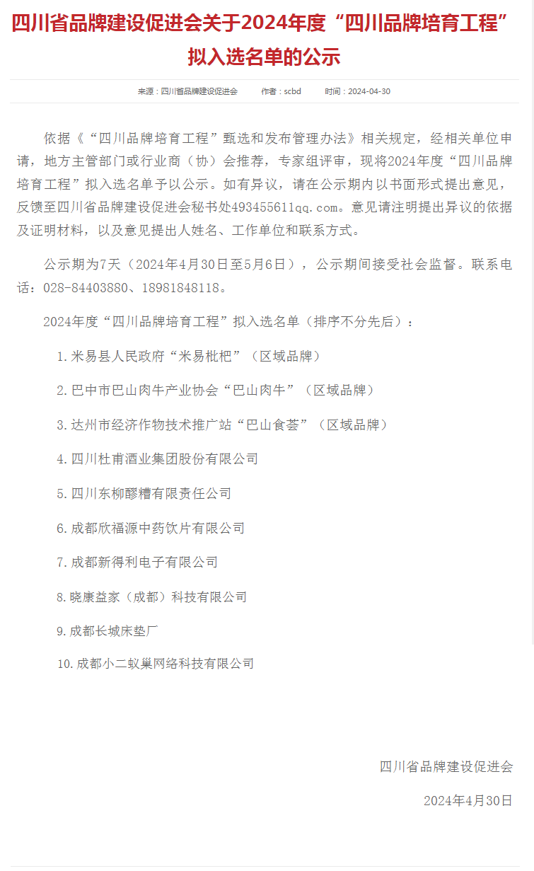 四川省品牌建设促进会关于2024年度“四川品牌培育工程” 拟入选名单的公示