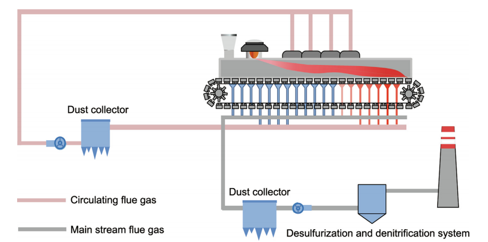 在内循环技术中,可以选择高温、富氧、高浓度污染物等不同特性的波纹管进行优化。例如,日本新日铁开发了区域废气循环技术,德国HKM开发了低排放和能源优化烧结生产(LEEP)技术,奥钢联开发了环境过程优化烧结(Eposint)技术。对于这些技术,从不同的波纹管中有选择地收集一部分携带热量的烟气并返回烧结机,从而回收了烧结的一部分废热并减少了固体燃料。循环烟气中还含有NOx、CO和二恶英,可部分净化。近期,在国家重点研发计划项目“钢铁工业烟气多种污染物全流程控制关键技术”的支持下,中科院过程工程研究所与海布士集团联合开发了烧结烟气循环节能质量强化耦合技术,如图1所示。