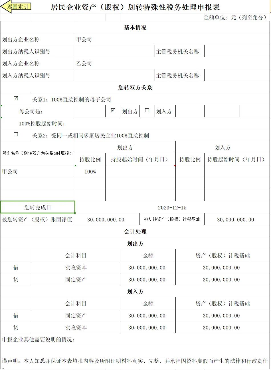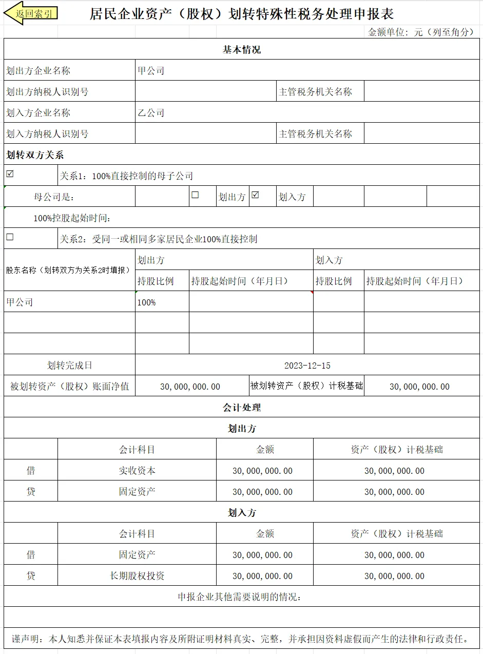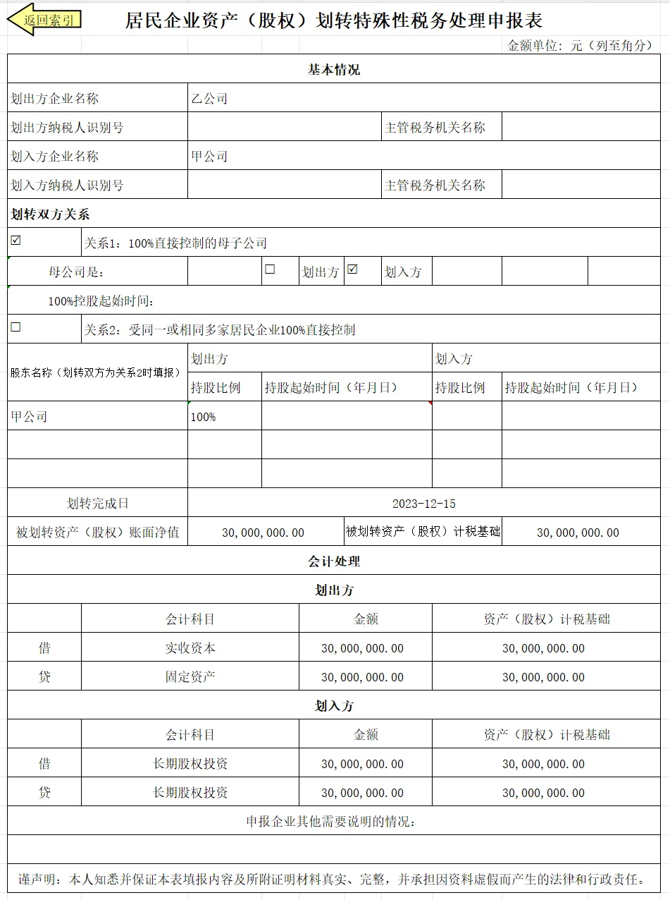 2023年12月15日,甲公司将3000万元的固定资产划转给乙公司,获得乙公司100%的股权,暂不考虑增值税等相关税种处理。