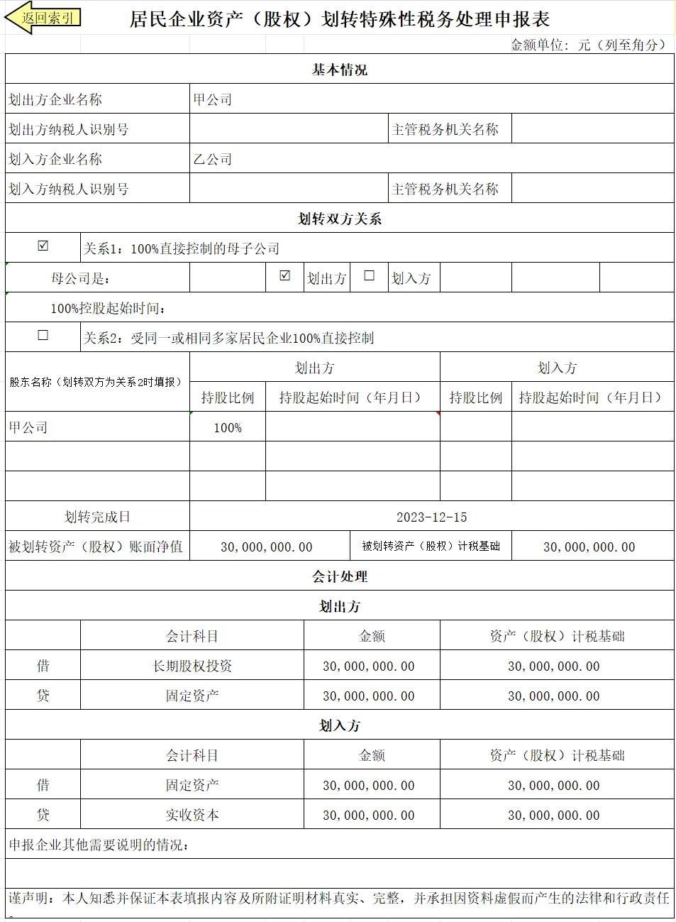 2023年12月,乙公司为甲公司直接控制的全资子公司,乙公司将3000万元的固定资产无偿划转给甲公司,暂不考虑增值税等相关税种处理。