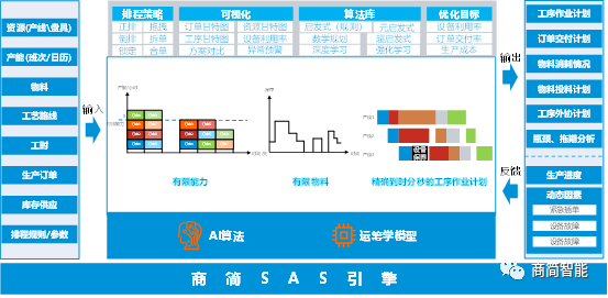 智能APS致力于为制造业企业提供由「数据驱动、基于人工智能和运筹学算法」的工业智能决策解决方案,帮助制造企业实现降本增效。商简智能自主研发的「“智能计划与排程系统”(Smart Planning and Scheduling,SPS)」采用先进的计算技术,考虑了「工艺路径、订单、能力、班次、工时、物料」等要素,可以产生更精确、更实际的生产计划,再通过大量的数学模型、优化及模拟技术,对生产计划进行进一步的优化,可大幅提升各项生产指标,实现分钟级计划和排程。