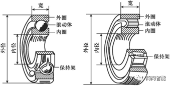 轴承是当代机械设备中一种重要零部件。它的主要功能是支撑机械旋转体,降低其运动过程中的摩擦系数,并保证其回转精度。按运动元件的摩擦性质不同,轴承可分为「滚动轴承」和「滑动轴承」两类,其中滚动轴承最为常见。滚动轴承一般由「内圈、外圈、滚动体和保持架」四部分组成,内圈的作用是与轴相配合并与轴一起旋转;外圈作用是与轴承座相配合,起支撑作用;滚动体是借助于保持架均匀的将滚动体分布在内圈和外圈之间,其形状大小和数量直接影响着滚动轴承的使用性能和寿命;保持架能使滚动体均匀分布,引导滚动体旋转起润滑作用。