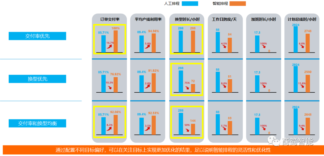 下图为商简SPS在该集团内部某型号的产品线上使用后的结果,通过配置不同目标偏好,可以在关注目标上实现更加优化的结果,足以说明智能排程的灵活性和优化性。