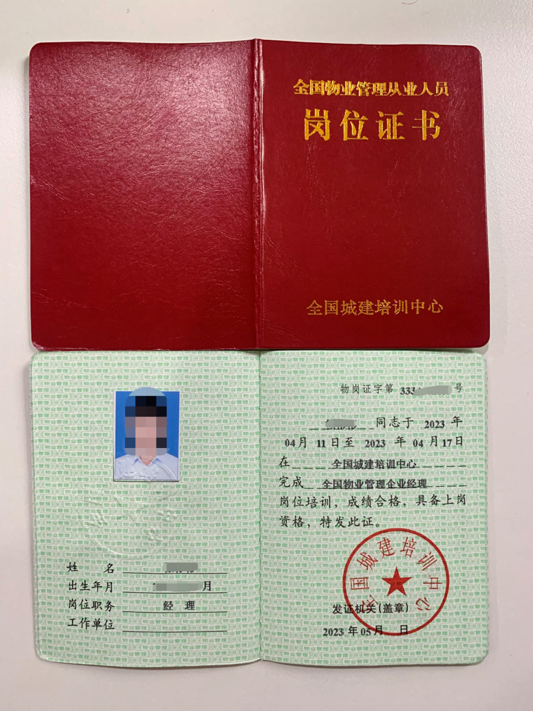 全国物业企业经理证(又叫全国物业管理从业人员岗位证书,简称:岗位证书)