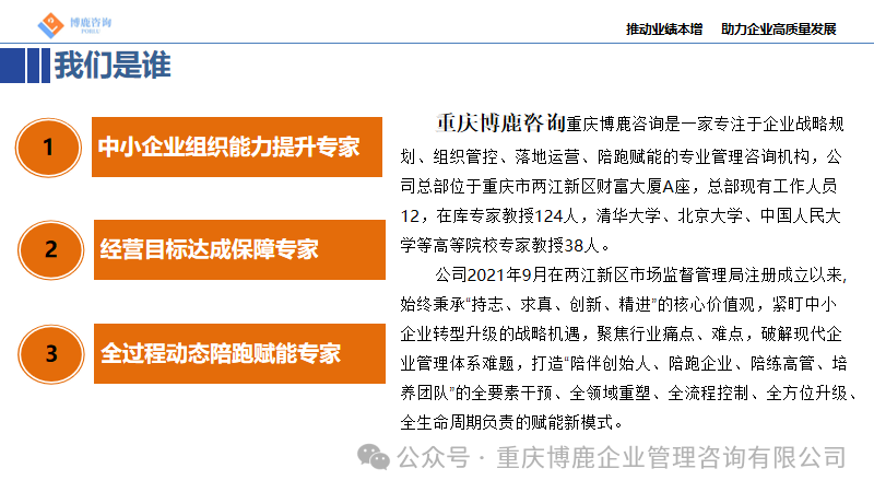 博鹿咨询是一家专注于保障中小企业战略落地,推动企业业绩倍增,致力于通过建立规范化内部管控体系,助力中小企业高质量发展的专业管理咨询机构,提升企业组织和经营管控能力来促使企业达成战略目标、营收及利润目标,团队成员均有10年以上企业实战经验一切辅导以结果为导向,实现让企业高质量发展。