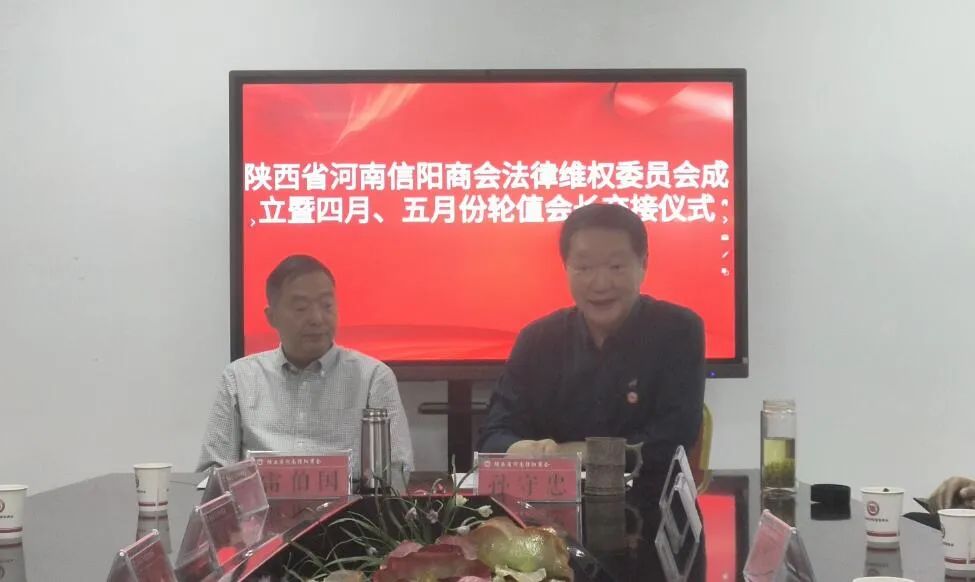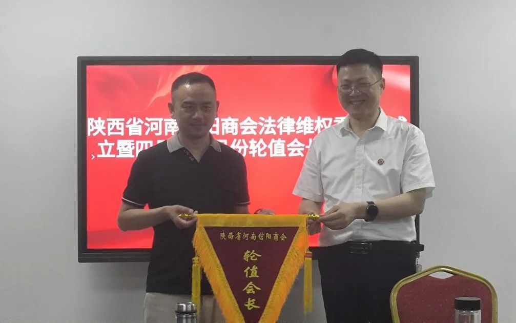 4月28日下午,陕西省河南信阳商会举行2024年4、5月份轮值会长交接仪式。商会会长孙守忠,商会党支部副书记雷伯国,商会执行副会长吴洪彬、陈明安出席会议并讲话。商会副会长、固始分会秘书长张振国代表4月份轮值团队总结了4月份轮值工作,商会常务副会长、罗山分会会长方思生接棒5月份轮值会长。会议由商会秘书长顾书亮主持。