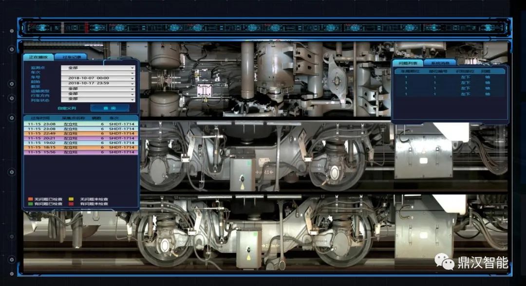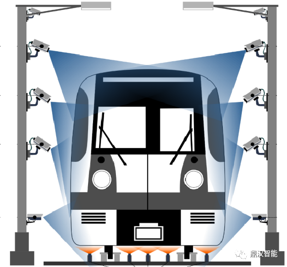 车体360 °检测系统,运用线阵高清彩色成像、AI自学习、三维检测等技术,以不停车检测的⽅式对经过车辆外观进⾏全景彩色实时扫描,在真实还原现场的前提下,对⻋辆状态进⾏智能检测分析,可有效识别车体部件螺丝松动、箱盖脱落、裂纹破损、油脂渗漏等常见问题,并针对异常进⾏预警提示,运用⼤数据分析技术,可清晰掌握车体部件变化趋势,提前预知各部件的老化破损程度,将“计划修”变为“状态修”。