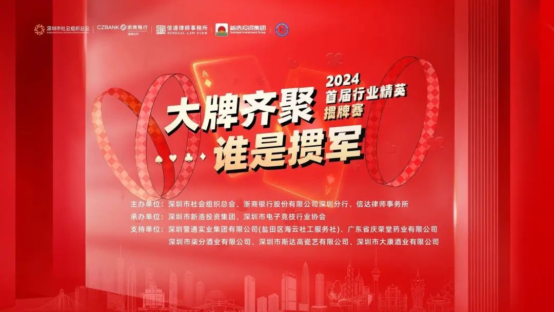 2024年4月29日,由深圳市社会组织总会、浙商银行股份有限公司深圳分行、信达律师事务所联合主办,深圳市电子竞技行业协会、深圳市新浩投资集团承办的“2024首届行业精英掼牌赛”在福田·金中环商务大厦6楼新浩口腔医院金中环厅圆满落幕。此次活动得到了深圳警通实业集团有限公司(盐田区海云社工服务社)、广东省庆荣堂药业有限公司、深圳市柒分酒业有限公司、深圳市斯达高瓷艺有限公司和深圳市大康酒业有限公司的大力支持。