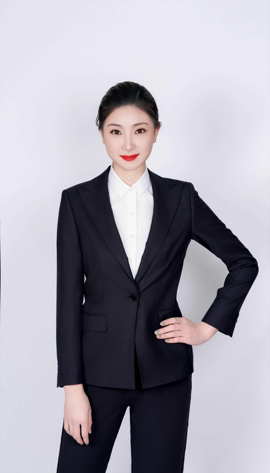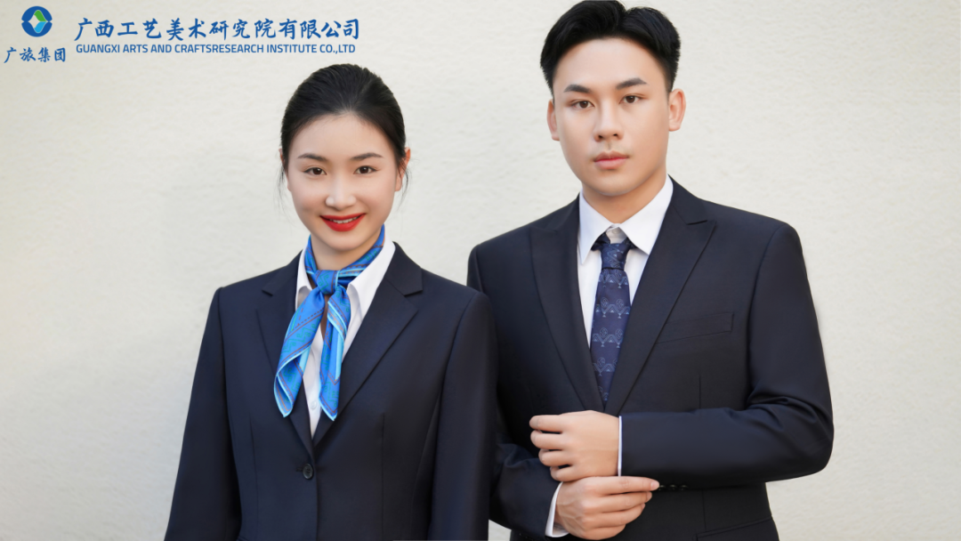 广西工美院商务装系列设计精选融合了部分企业文化。代表款式以藏青色与白色为主色调,区别于传统商务西服之黑色,更富有品质,视觉效果更为高雅。并在融入企业文化的同时,则更加注重产品的版型,采用结合大数据职场人身材体型调研,制作出更合适的服装版式。
