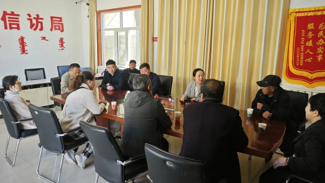 集团公司王雄参加由旗政府办相关领导主持的调解会议,会议针对呼和木独镇查汗淖嘎查鄂尔多斯市鸿旺养殖有限责任公司的土地权属信访案件进行讨论与调解。