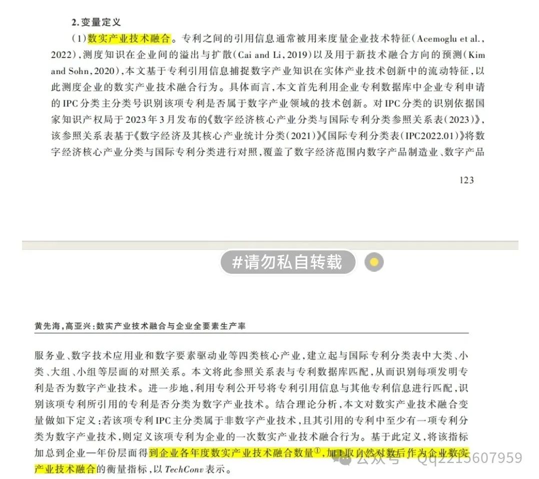 2.测算方式:参考顶刊《中国工业经济》黄先海(2023)老师研究的做法,本文基于专利引用信息捕捉数字产业知识在实体产业技术创新中的流动特征,以此测度企业的数实产业技术融合行为。具体而言,本文首先利用企业专利数据库中企业专利申请的IPC分类主分类号识别该项专利是否属于数字产业领域的技术创新。对IPC分类的识别依据国家知识产权局于2023年3月发布的《数字经济核心产业分类与国际专利分类参照关系表(2023)》,该参照关系表基于《数字经济及其核心产业统计分类(2021)》国际专利分类表(IPC2022.01)》将数字经济核心产业分类与国际专利分类进行对照,覆盖了数字经济范围内数字产品制造业,数字产品服务业、数字技术应用业和数字要素驱动业等四类核心产业,建立起与国际专利分类表中大类、小类、大组、小组等层面的对照关系。本文将此参照关系表与专利数据库匹配,从而识别每项发明专利是否为数字产业技术。进一步地,利用专利公开号将专利引用信息与其他专利信息进行匹配,识别该项专利所引用的专利是否分类为数字产业技术。结合理论分析,本文对数实产业技术融合变量做如下定义:若该项专利IPC主分类属于非数字产业技术,且其引用的专利中至少有一项专利分类为数字产业技术,则定义该项专利为企业的一次数实产业技术融合行为。基于此定义,将该指标加总到企业一年份层面得到企业各年度数实产业技术融合数量Q,加1取自然对数后作为企业数实产业技术融合的衡量指标,以TechConv表示。具体的大家可以看一下参考文献