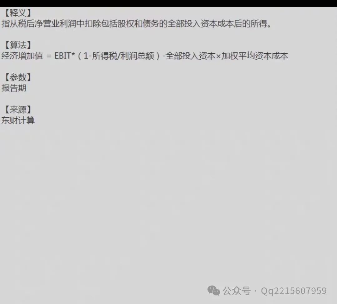 公式:EVA=EBIT*(1-所得税/利润总额)-全部投入资本✖️加权平均资本成本