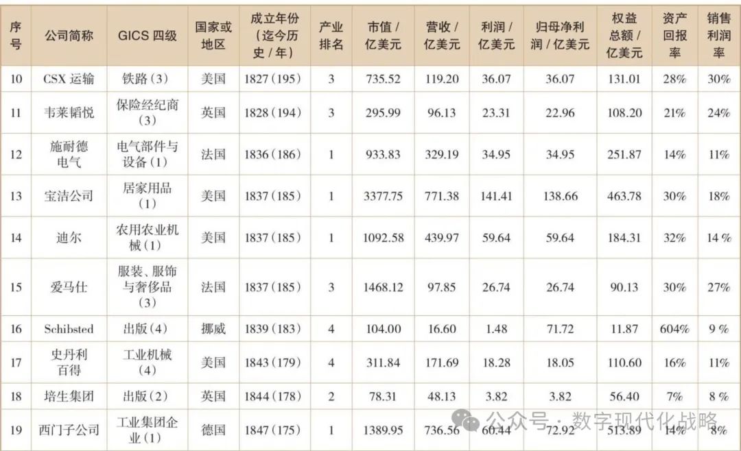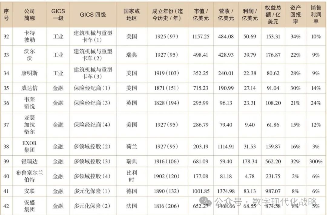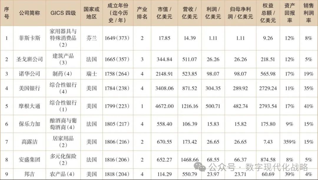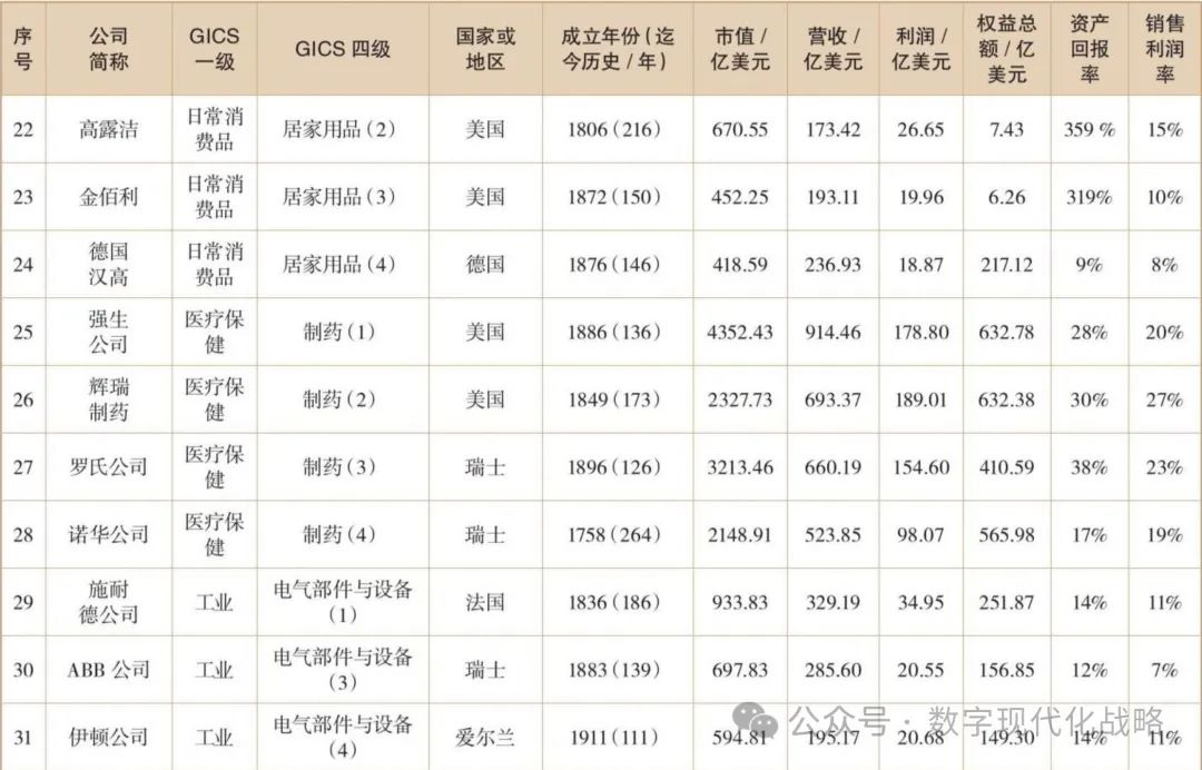 我列出了所有的全球产业冠军企业158家,以及在全球产业前4名以内的企业中,挑出符合市值超过1000亿美元、营收超过1000亿美元、利润超过100亿美元中的任意一项指标的企业44家,与158家全球产业冠军企业合计202家。在这202家企业中,企业历史在100年及以上的有36家;在这36家企业中,有全球产业冠军29个,产业亚军2个,产业季军3个,产业殿军(本殿军指第4名——编者注)2个。其中美国企业22家,德国企业5家,瑞士企业3家,英国企业2家,日本企业2家,丹麦企业1家,澳大利亚企业1家。其中大众比较熟知的企业有高盛集团、强生公司、梅赛德斯-奔驰公司、罗氏公司、宝洁公司、雀巢公司、诺华公司、可口可乐公司、百事公司、洛克希德·马丁、西门子公司、三菱、迪士尼等。这确实证明了世界上存在不少有百年历史的优秀企业。