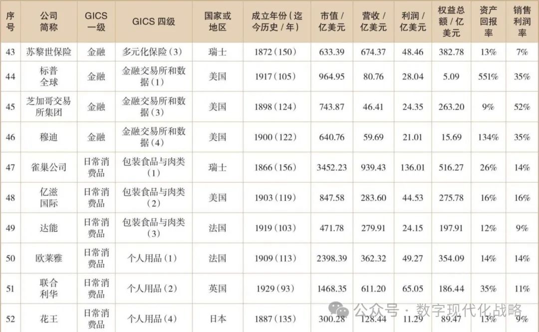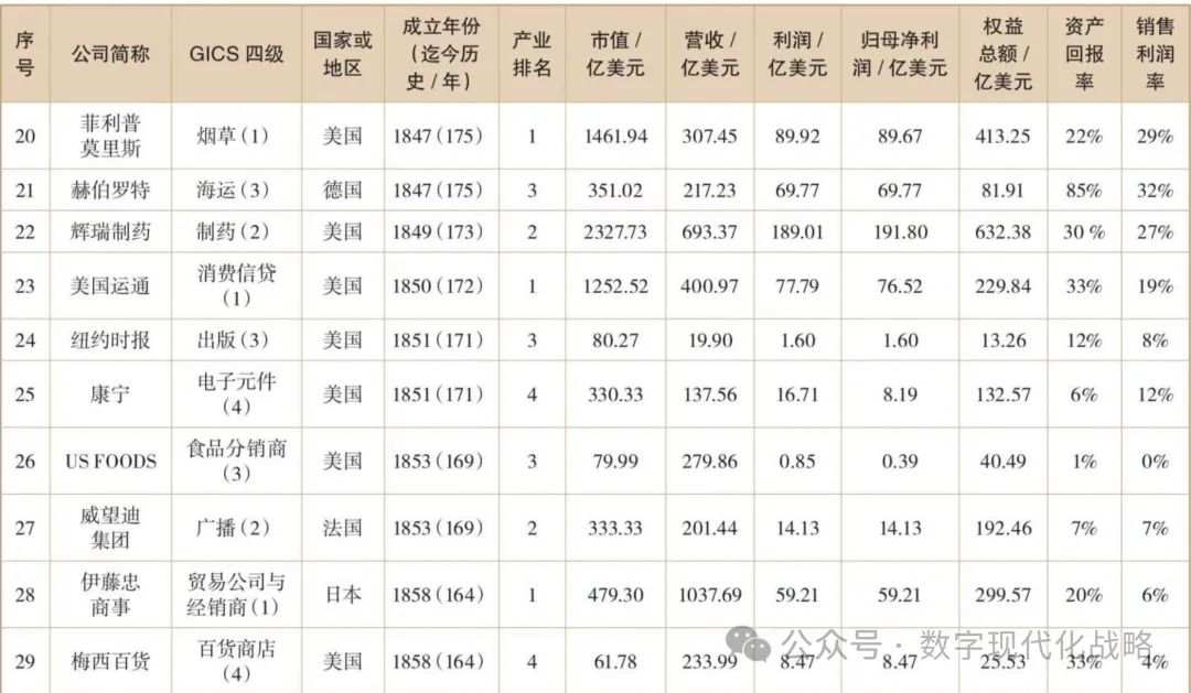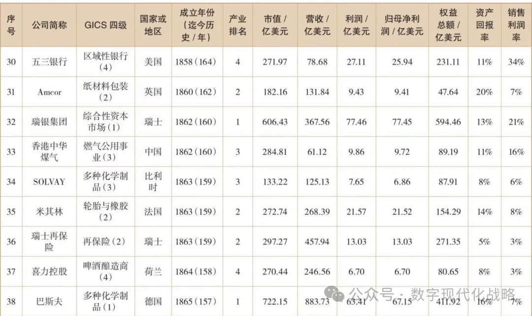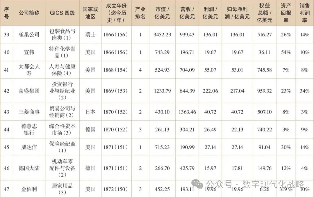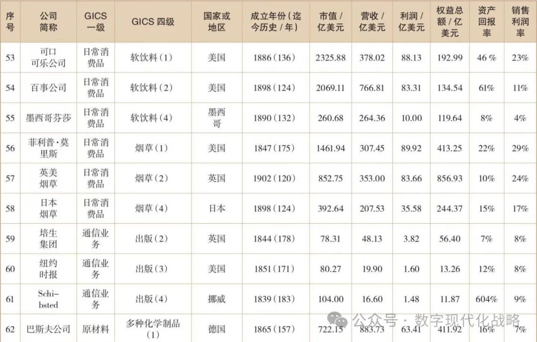 我列出了所有的全球产业冠军企业158家,以及在全球产业前4名以内的企业中,挑出符合市值超过1000亿美元、营收超过1000亿美元、利润超过100亿美元中的任意一项指标的企业44家,与158家全球产业冠军企业合计202家。在这202家企业中,企业历史在100年及以上的有36家;在这36家企业中,有全球产业冠军29个,产业亚军2个,产业季军3个,产业殿军(本殿军指第4名——编者注)2个。其中美国企业22家,德国企业5家,瑞士企业3家,英国企业2家,日本企业2家,丹麦企业1家,澳大利亚企业1家。其中大众比较熟知的企业有高盛集团、强生公司、梅赛德斯-奔驰公司、罗氏公司、宝洁公司、雀巢公司、诺华公司、可口可乐公司、百事公司、洛克希德·马丁、西门子公司、三菱、迪士尼等。这确实证明了世界上存在不少有百年历史的优秀企业。