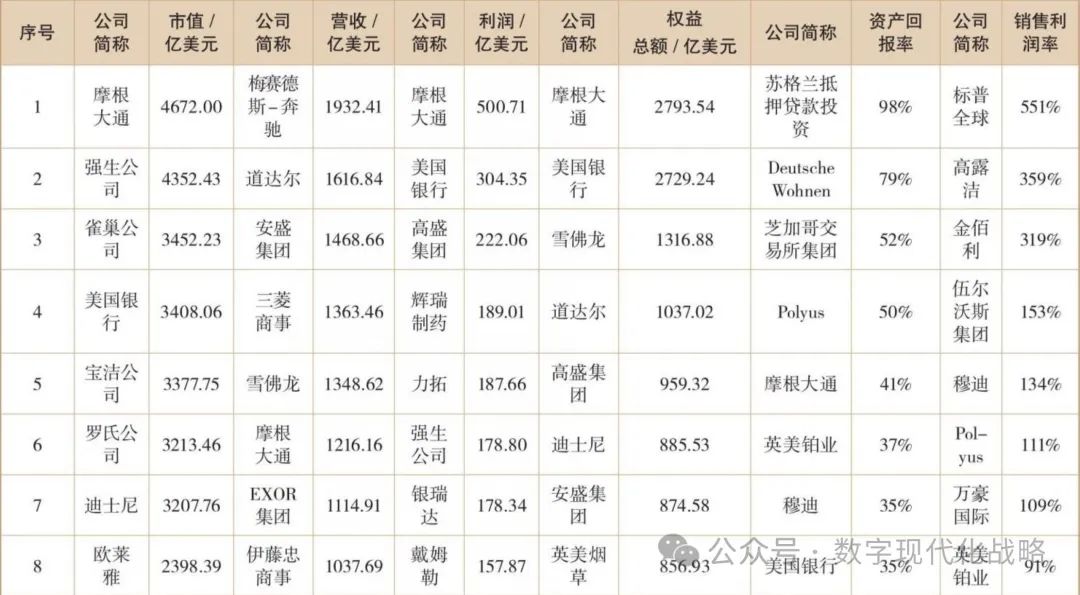 市值最高的是摩根大通,为4672亿美元,利润和权益总额最高的也是摩根大通,分别为500.71亿美元和2793.54亿美元。摩根大通的历史为223年,成立于1799年。营收最高的是梅赛德斯-奔驰公司,为1932亿美元,其成立于1890年,历史为132年。