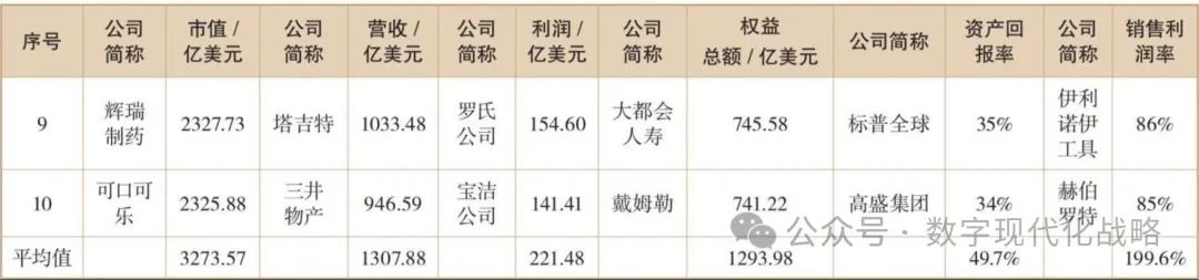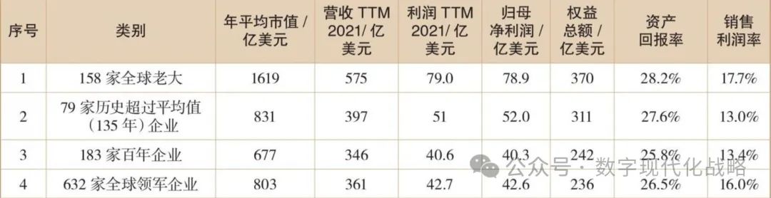 以上数据说明,在百年企业中的最优秀者,有着巨大的市值、巨大的市场规模和利润规模,以及优异的企业经营效率指标。