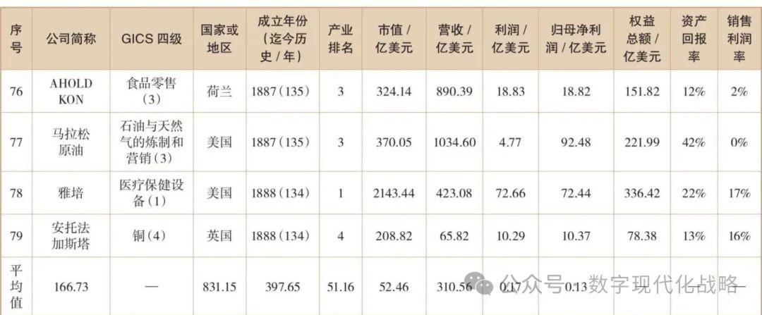 表3 历史超过平均值(134年历史)的79家企业及其主要数据