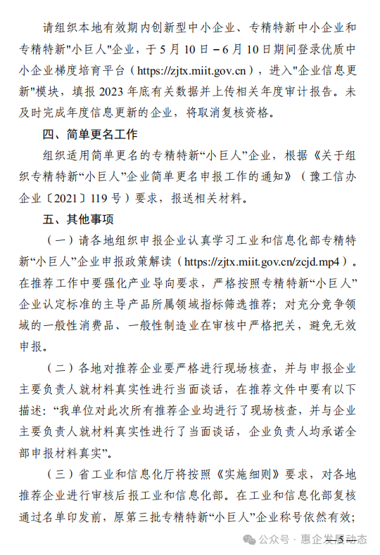 (三)省工业和信息化厅将按照《实施细则》要求,对各地推荐企业进行审核后报工业和信息化部。在工业和信息化部复核通过名单印发前,原第三批专精特新“小巨人”企业称号依然有效;复核通过名单印发后,原第三批专精特新“小巨人”企业称号自动失效,以该名单内企业为准。