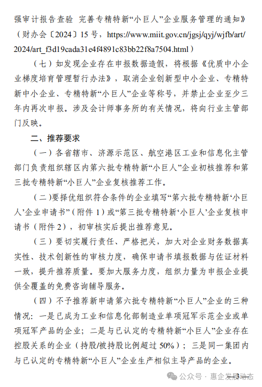 (一)省级专精特新中小企业可提出第六批专精特新“小巨人”企业申请,第三批专精特新“小巨人”企业可提出复核申请,相关申请均不收取任何费用。