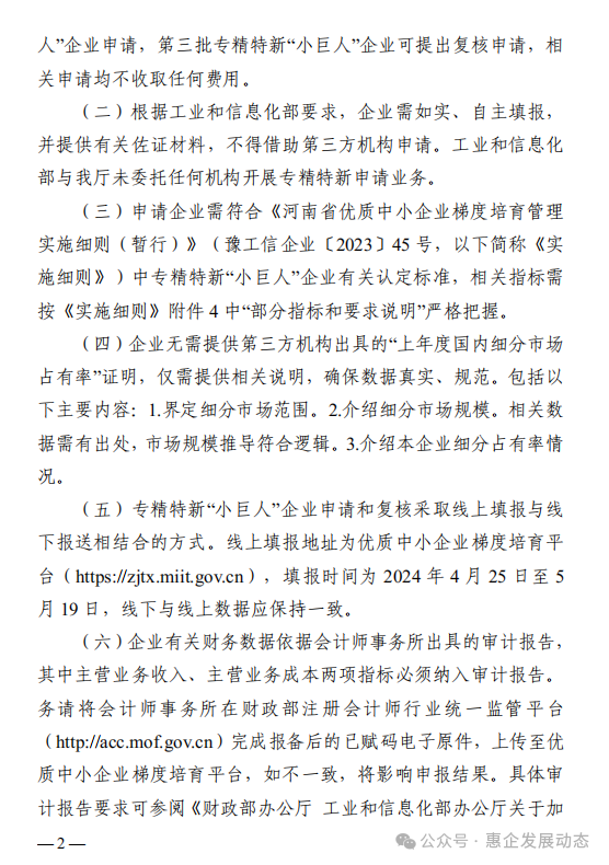 (二)根据工业和信息化部要求,企业需如实、自主填报,并提供有关佐证材料,不得借助第三方机构申请。工业和信息化部与我厅未委托任何机构开展专精特新申请业务。