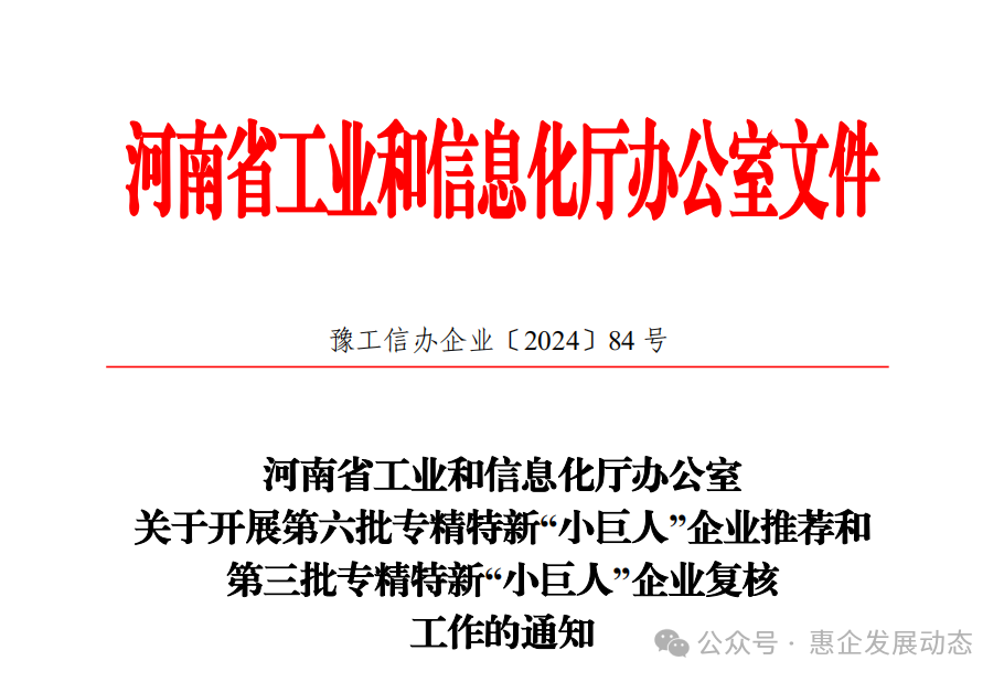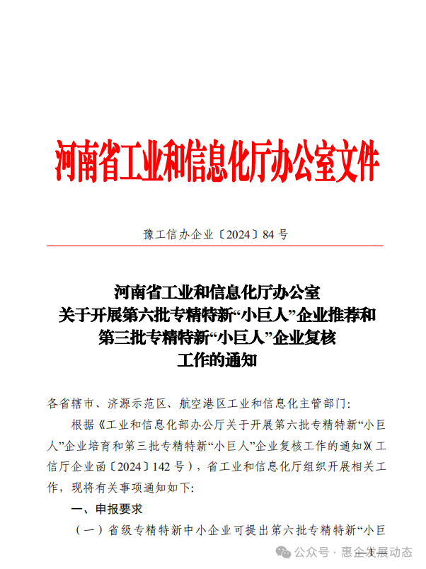 根据《工业和信息化部办公厅关于开展第六批专精特新“小巨人”企业培育和第三批专精特新“小巨人‗企业复核工作的通知》(工信厅企业函〔2024〕142 号),省工业和信息化厅组织开展相关工作,现将有关事项通知如下: