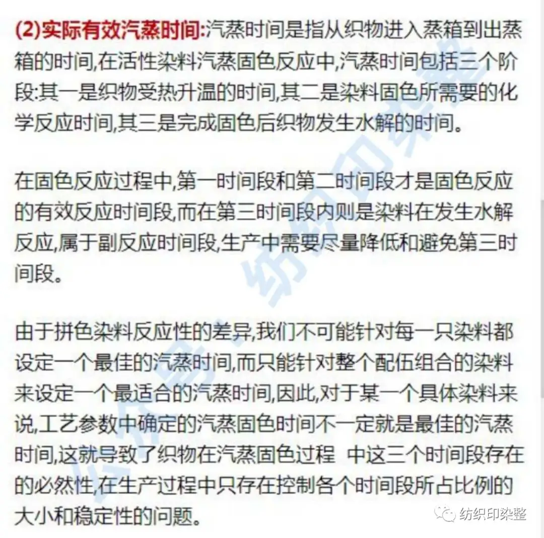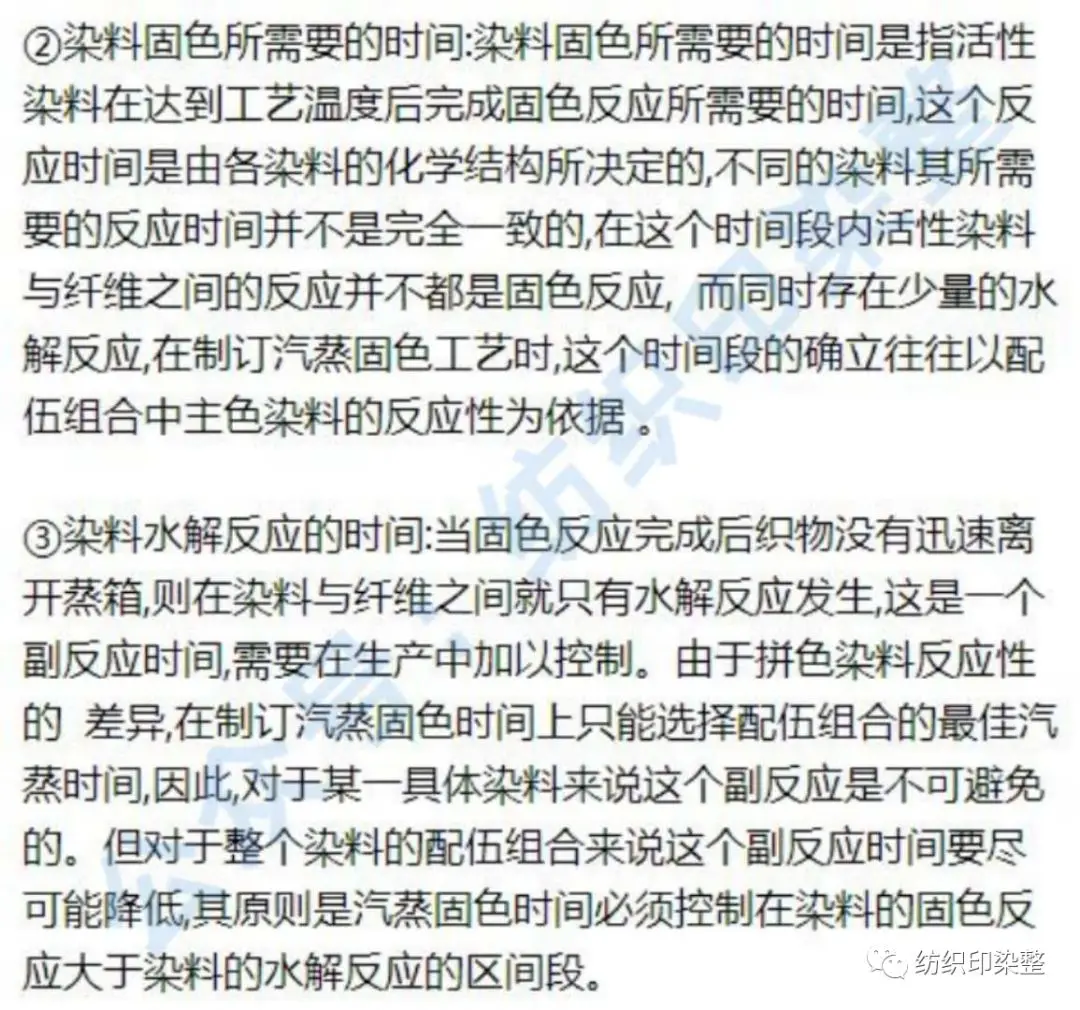 ①织物受热升温所需要的时间:织物受热升温是活性染料固色反应所必须具备的条件,在这个升温过程中,染料主要是发生固色反应,而水解反应很少,因此,没有必要去控制这一反应时间,但不同的织物和不同的带液量都会影响这一时间的长短,在制订汽蒸工艺时要根据织物的厚薄和带液量的大小来增减汽蒸固色的时间。