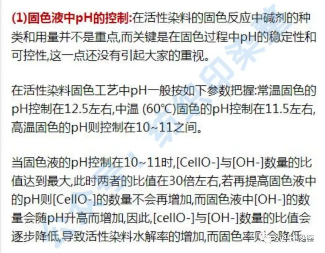 烧碱在固色液中是完全离子化的,从提做固色液的碱度这个方面来考虑,其性价比是最高的,但烧碱在反应过程中没有缓冲性,一旦工艺条件稍有改变,即会导致固色液中pH的较大波动,进而引起颜色的波动。而纯碱在固色液中缓冲能力较强,固色液中pH会比较稳定,但碱度的性价比不高。