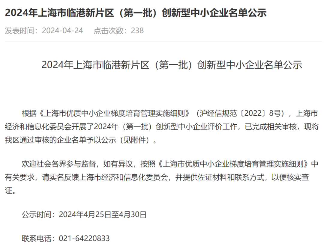 近日,根据《上海市优质中小企业梯度培育管理实施细则》(沪经信规范〔2022〕8号),上海市经济和信息化委员会开展了2024年(第一批)创新型中小企业评价工作,已完成相关审核,并发布了关于2024年上海市临港新片区(第一批)创新型中小企业名单的通知。平台公司荣获“上海市创新型中小企业”认定。