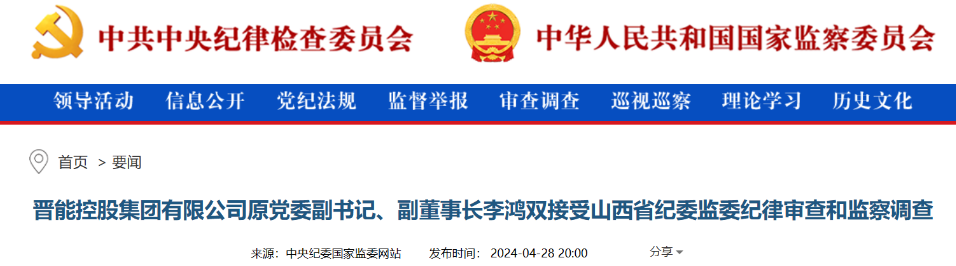 4月28日,中央纪委国家监委网站消息,据山西省纪委监委消息:晋能控股集团有限公司原党委副书记、副董事长李鸿双涉嫌严重违纪违法,目前正接受山西省纪委监委纪律审查和监察调查。